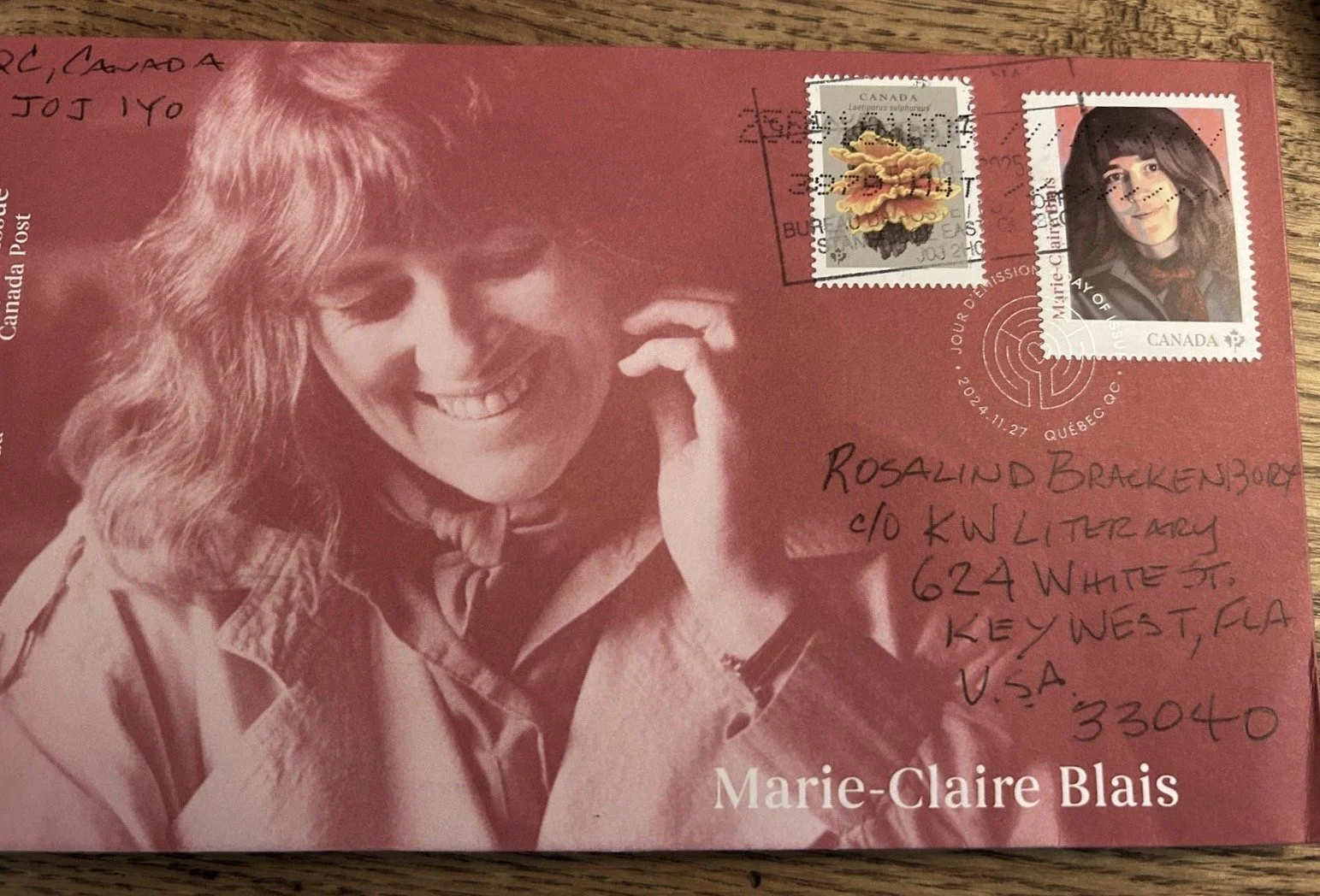 Anyway, this week I received a letter from Canada from a woman I don’t know, but who knows I’m here and was a friend of Marie-Claire Blais. It’s a first-day envelope with a picture Marie-Claire on the front, a stamp with a photo of her when young, and a quote from her on the back in French and English. “On écrit parce qu’on a une vision du monde et on veut le partager avec le plus de monde possible. Il y a ce besoin de communiquer et de décrire l’univers.” “We write because we have a vision of the world and we want to share it with as many people as possible. There is this need to communicate and to describe the universe.” Canadians do everything twice, once in each language.